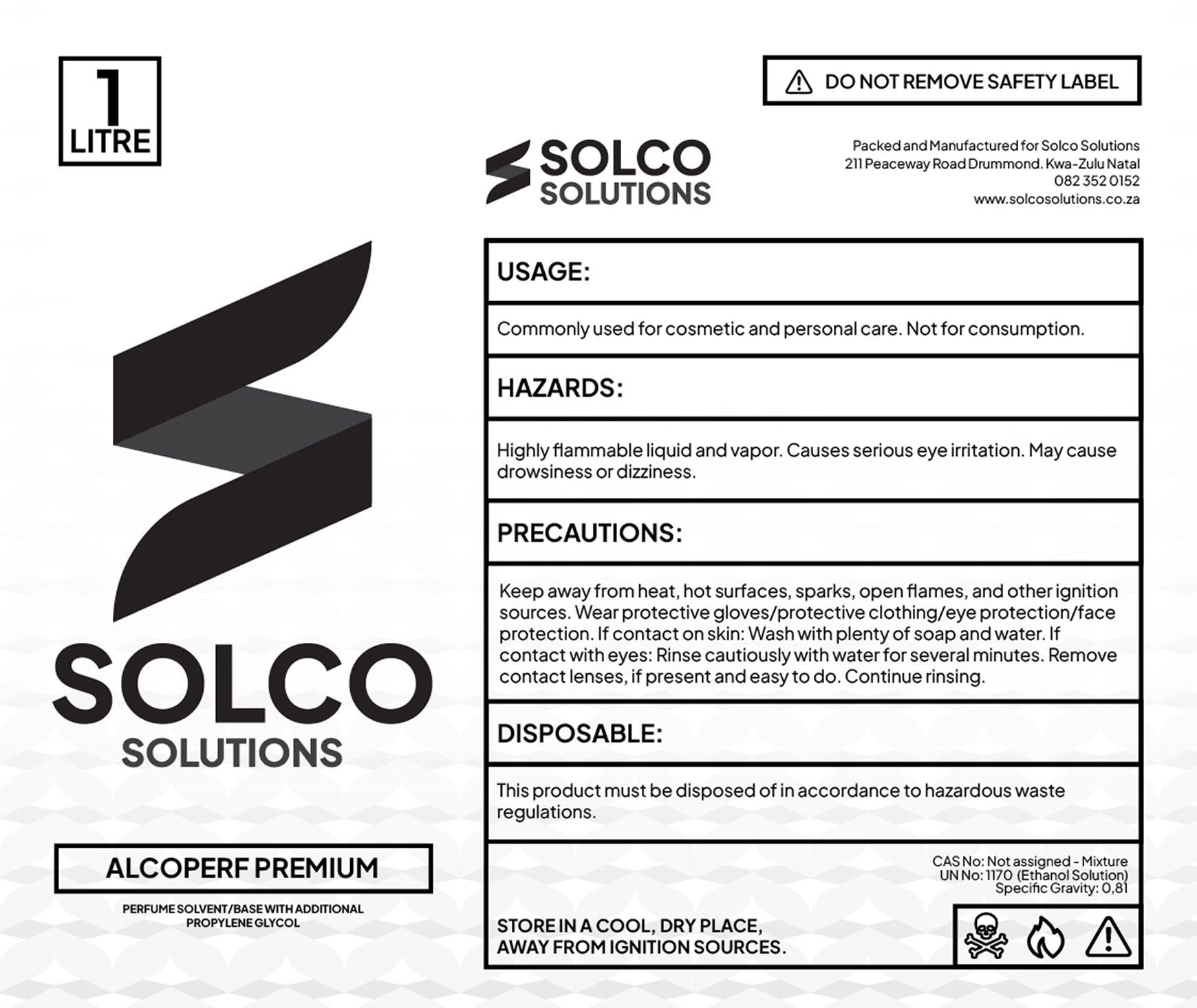 Product regularity codes and information: CAS No:Not applicable .Mixture UN No: 1170 (Ethanol Solution) Specific Gravity: 0,81
