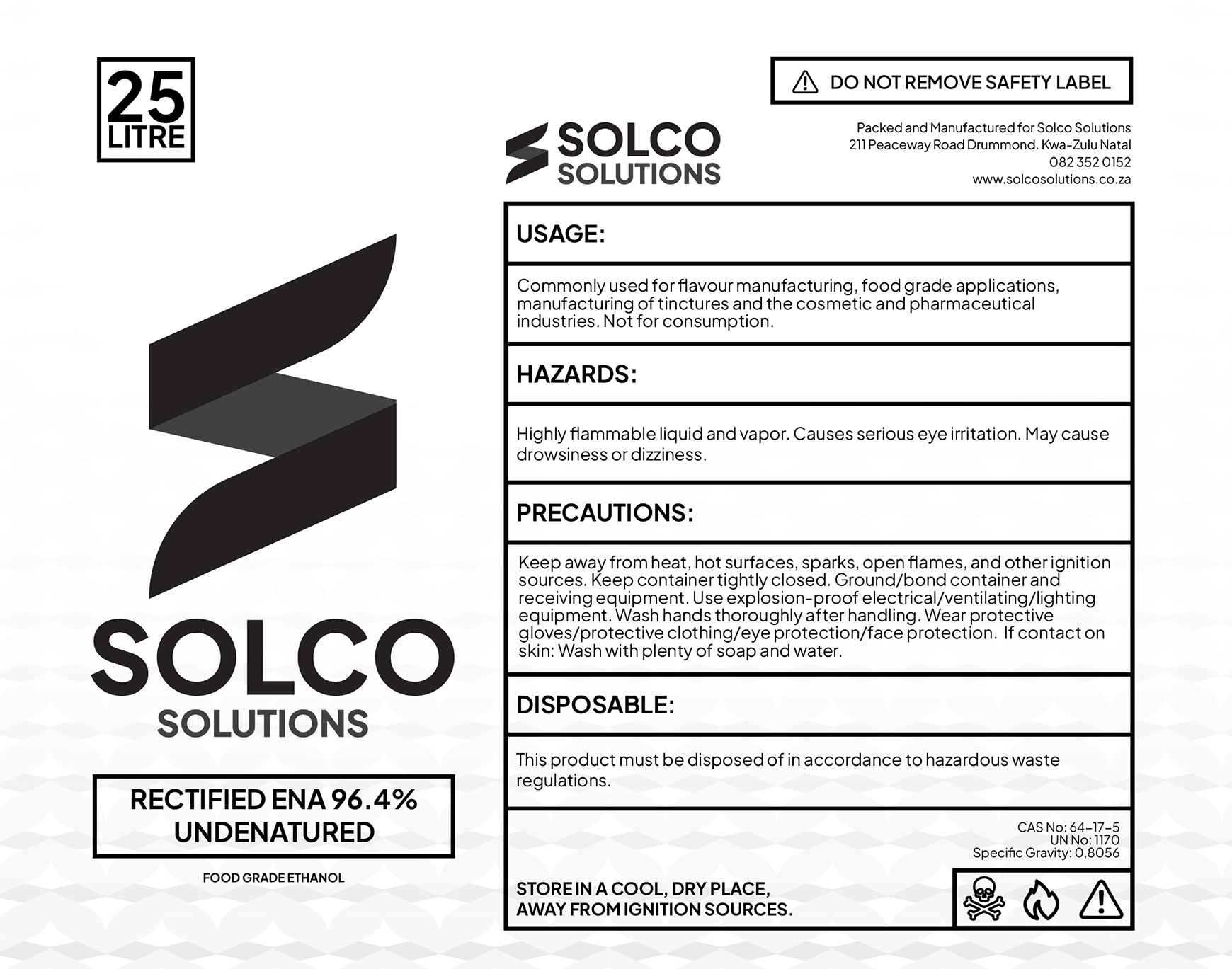 Product regularity codes and information: CAS No: 64-17-5 UN No: 1170 Specific Gravity: 0,8056